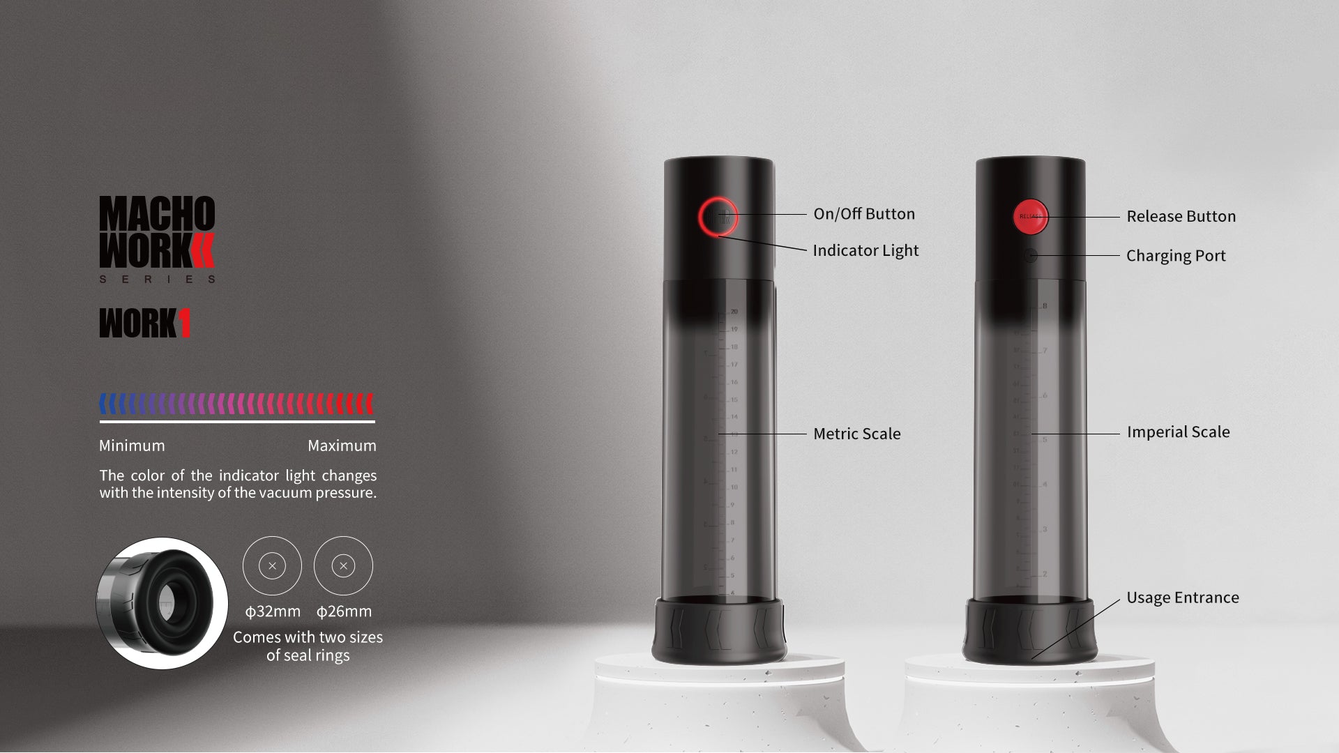 MACHO WORK 1 is a powerful automatic penis pump designed for stronger, more controlled suction and a confident, comfortable fit. The stepless suction system lets you build vacuum pressure smoothly with no preset levels, so you can dial in the exact intensity that feels best for you. As you pump, the vacuum indicator light shifts from blue to red to show pressure levels clearly, giving you quick visual control without guessing.